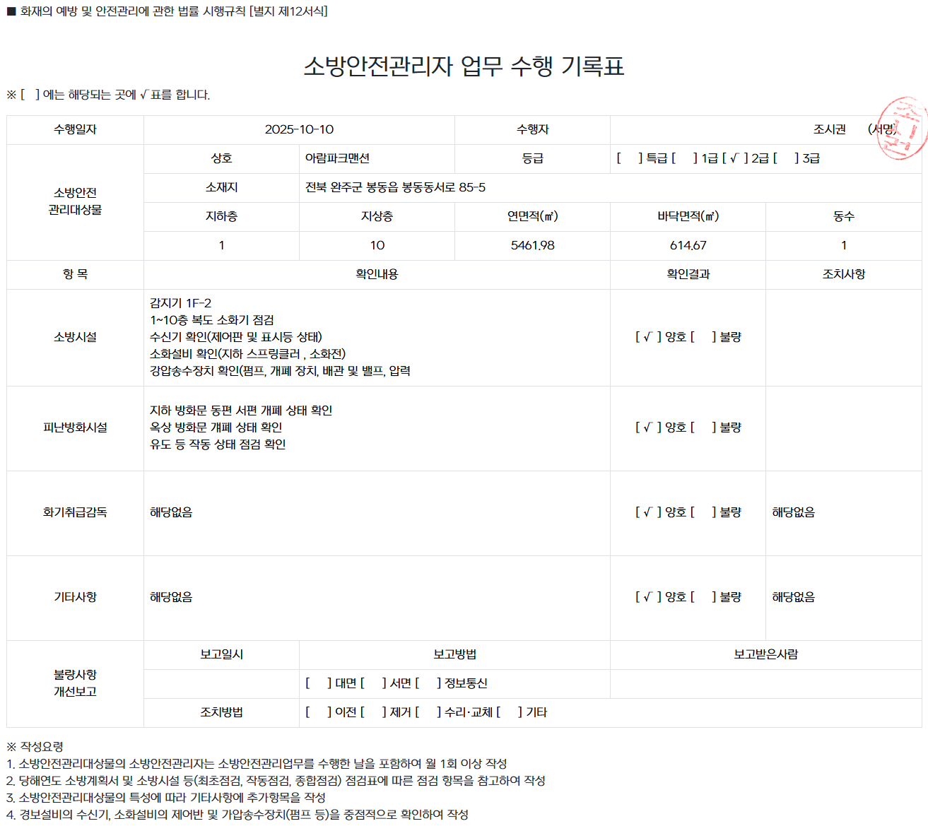 최근 아파트 소방 종합 점검에서 지적되었던 사항들에 대해 모든 개선 조치를 완료했습니다.