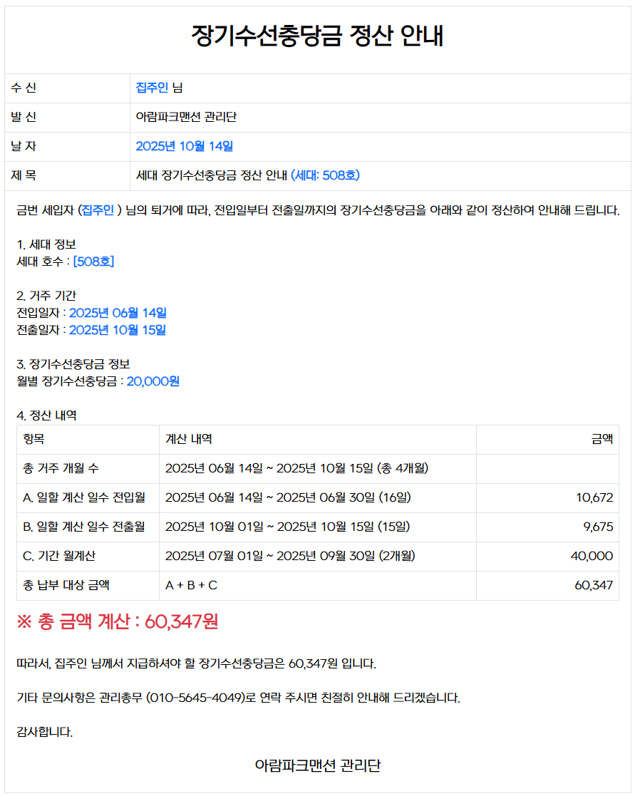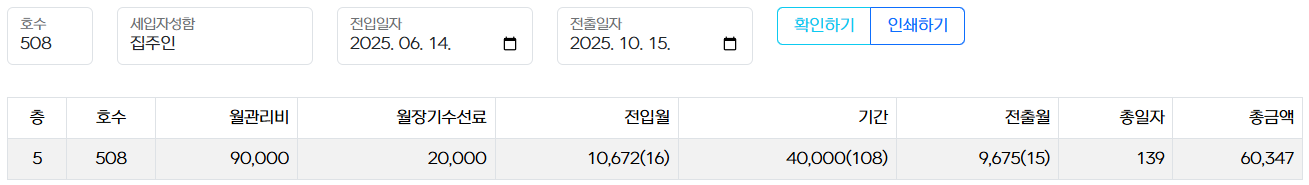 호수를 입력하고 세입자 성함 / 전입일자 / 전출일자 입력하고 확인을 누르면 아래와 같이 자동 계산됩니다.