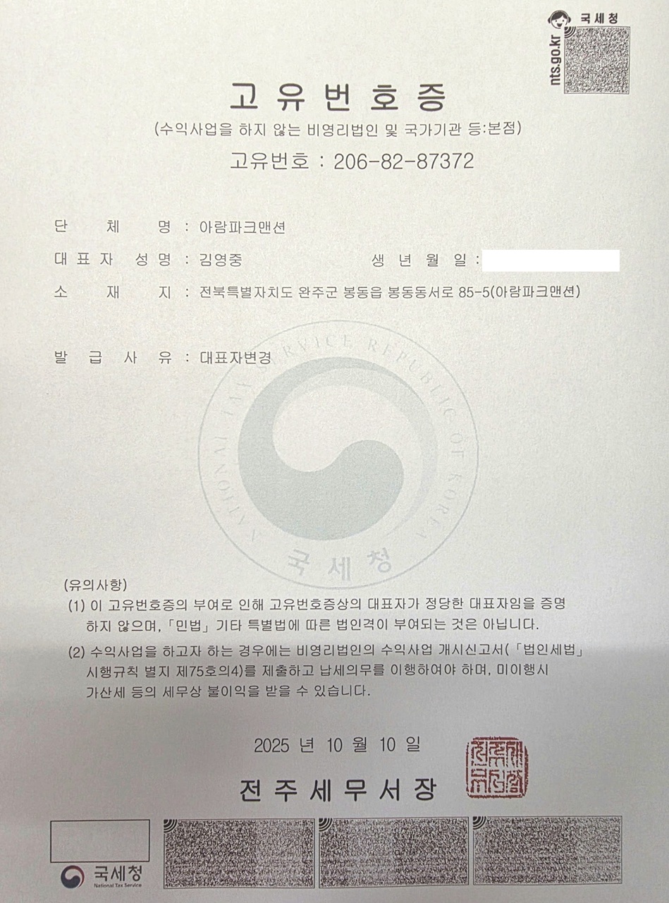 아람파크맨션 고유번호증 등록이 완료되었습니다.